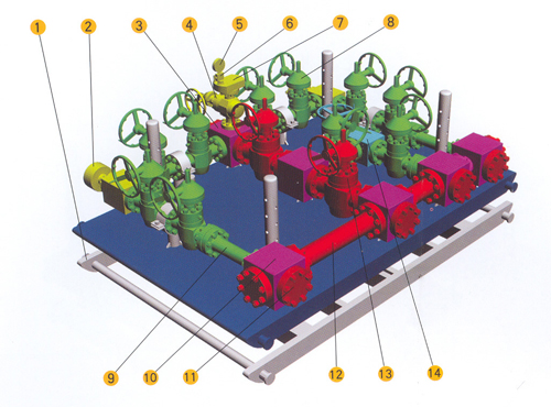1.Application Choke manifold is necessary device to control the well kick successfully and execute the pressure control technology on oil/gas well in the course of drilling, as it is, the device is adopted to execute new drilling-well's technique of balance pressure, which can avoid pollution of oil-layer, improve the speed of drilling and control blowout effectively. One end of the device connects with the side flange of BOP spool. When BOP closes, it can control the finite pressure from casing by adjusting the choke valve's opening, so balanced drilling can work under minimum pressure-difference . 2、Assembly &structure Choke manifold consists of choke valve, gate valve, pipeline, ffittings and pressure gauge etc, see gate valve part and choke valve part in the above drawing. 3、Working principle When the pressure rising in well,fluid in well can be released in utilization of the choke valve opening/closeing in choke manifold to control casing pressure, which can directly blow out through gate valve as the casing pressure is quite high. 4、Specification Pressure level is divided into five levels, i.e. 14MPa,21MPa, 35MPa, 70MPa and 105MPa, it can be also designed according to the requirement of customer. 5、0peration requirement (1)All the working pressures of parts in choke manifold should be matched with the working pressure of BOP stack used; (2)Choke manifold should be installed at the place where operator approach it conveniently, pressure test should be executed as installation , while the sealing test pressure should be equal to the rated working pressure; (3)Pipeline should be so smooth and straight as possible, the corner of the pipeline should be made of 120o haped forged steel bent pipe, which should have adequately large bore; (4)The working pressure gauge should be installed; (5)In winter, the choke manifold be able to work under a low temp condition.