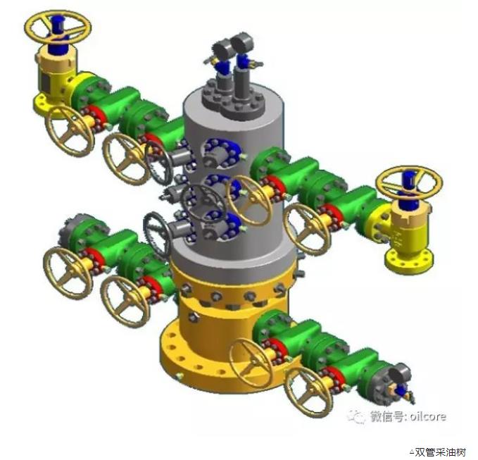 雙油管采油樹安裝在雙油管完井的井口裝置上,用于兩個油層同時而又獨立開采的生產控制。雙油管完井是在同—個生產套管中下入兩根平行油管柱(長油管柱和短油管柱)或兩根同心油管柱,通過雙管封隔器和單管封隔器對兩個油(或氣)層段進行分隔。