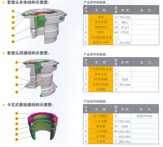 我公司生產的套管頭是標準結構,在其殼體內配置安裝我公司的套管懸掛器,并可根據套管程序和井口條件的變化選擇不同規格的套管懸掛器。本體的上部均為API 6B 法蘭或API 6BX法蘭。
